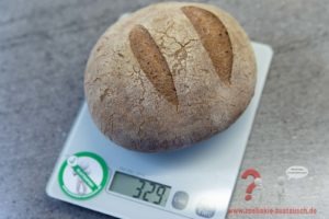 Es hat die typische Form und die Kruste eines Landbrotes. Auch der Geschmack entspricht dem eines hellen Sauerteigbrotes, was auch vom enthaltenen Buchweizen kommt. Das Gewicht war bei uns 329 Gramm (laut Webseite 340 Gramm).