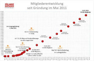 Mittlerweile ist die Gruppe, mit über 1.000 (Mai 2013), 2.000 (01.12.2013), 3.000 (14.4.2014), 4.000 ( 28.05.2014), 5.000 (10.8.2014) , 6.000 (02.11.2014) 7.000 (20.1.2015), 8.000 (03.04.2015), 9.000 (17.6.2015) 10.000 (14.09.2015) 11.000 (14.01.2016) 12.000 (22.04.2016) 13.000 (02.08.2016), 14.000 ( 04.11.2016), 15.000 (27.12.2016), 16.000 (25.2.2017) 17.000 ( 26.04.2017) 18.000 (09.07.2017), 19.000 (06.10.2017), 20.000 (26.12.2017), 22.000 (05.06.2018) 23.000 (18.10.2018), 24.000 (16.01.2019), 25.000 (25.04.2019), 26.000 (29.07.2019), 27.000 (26.10.2019) 28.000 (14.1.2020), 29.000 (02.04.2020), 30.000 ( 25.06.2020) 31.000 (17.08.2020), 32.000 (15.10.2020), 33.000 (03.01.2021), 34.000 (24.03.2021), 36.000 (24.08.2021), 37.000 (25.10.2021), 38.000 (21.01.2022), 39.000 (03.05.2022), 40.000 (18.06.2022), 41.000 (29.08.2022), 42.000 (3.11.2022), 43.000 (14.01.2023), (44.000) 26.03.203, 45.000 (03.06.2023), 46.000 (23.08.2023), 47.000 (28.10.2023), 48.000 (26.01.2024) , 49.000 (30.03.2024) , 50.000 (07.06.2024) , 51.000 (13.9.2024), 52.000 (6.01.2025), 53.000 (30.03.2025), 54.000 (26.05.2025), 55.000 (22.07.2025), 56.000 (28.09.2025), 57.000 (07.01.2026) Mitgliedern, die größte deutschsprachige Facebookgruppe mit dem Thema Zöliakie und glutenfreies Leben geworden.