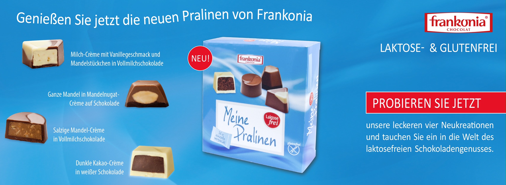Die meisten angebotenen Sorten sind gluten- und laktosefrei. Einige auch Fruktosefrei. Die Vielfalt wird ständig erweitert und Frankonia möchte auf die Anforderungen der Kunden noch besser eingehen . Aktuell gibt es Schokoladen, Schokoladenriegel, Haselnuss und Milch-Schnitten und Pralinen. Manche Schokoladen sind auch Sojafrei und teilweise Nussfrei. Bitte beachtet das es noch eine Sorte der Frankonia Haselnussschnitten (gelbe Verpackung) gibt, die nicht Glutenfrei ist.