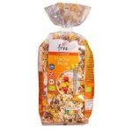 Zutaten:Glutenfreie HAFERvollkornflocken* 65%, Cornflakes* 10% (Maisgritz*, Rohrohrzucker*, Meersalz), Knusperbälle Kakao* 7% (Maisgrieß*, Rohrohrzucker*, Kakaopulver*, Meersalz), Kakaoflakes* 5% (Maisgrieß*, Reismehl*, Rohrohrzucker*, Kakaopulver*, Meersalz), Reiscrispies Zartbitter* 5% (Zartbitterschokolade* 3,4% (Kakaomasse*, Rohrohrzucker*, Kakaobutter*), Reisextrudat* (Reisvollkornmehl*)), Maiskugeln gecoated zartbitter* 4% (Zartbitterschokolade* 2,4% (Kakaomasse*, Rohrohrzucker*, Kakaobutter*), Getreideextrudat* (Maisgrieß*, Rohrohrzucker*, Kakaopulver*, Meersalz)), Cornflakes zartbitter* 3,5% (Cornflakes* (Maisgritz*, Rohrohrzucker*, Meersalz), Zartbitterschokolade* 1,5% (Kakaomasse*, Rohrohrzucker*, Kakaobutter*)), fettarmes Kakaopulver* *aus biologischer Landwirtschaft. Kann Spuren von Soja, Milch, Sesam, Senf, Lupinen und Schalenfrüchten/Nüssen enthalten.