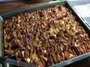 4. kg Zwetschen entkernen und auf dem Backblech anordnen und leicht festdrücken.