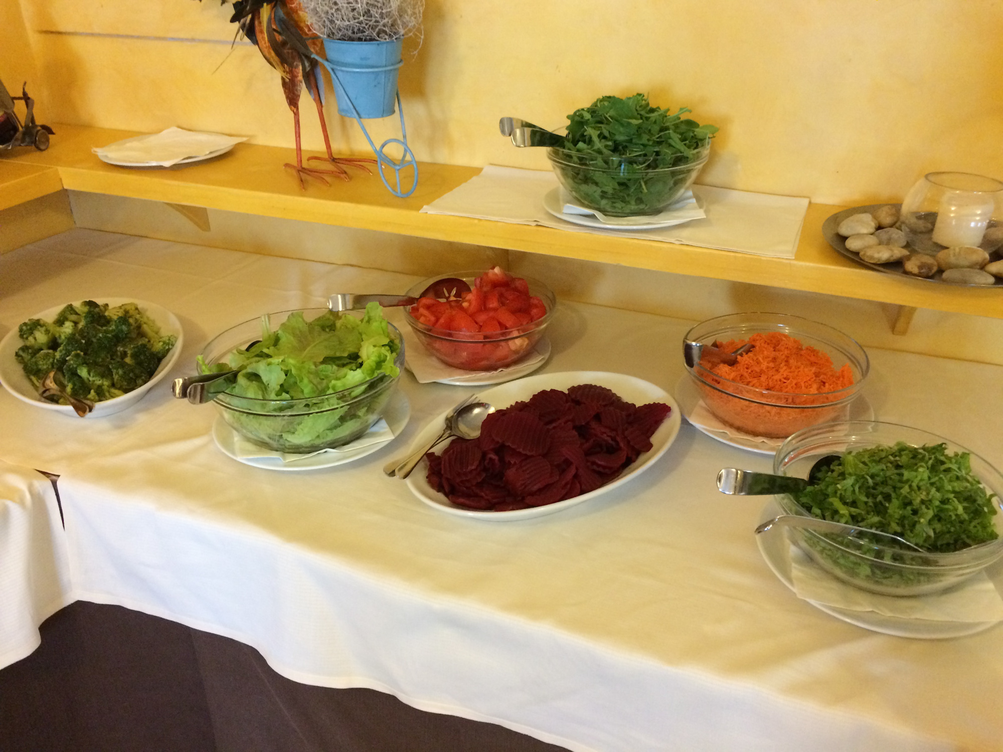 Es gibt immer eine Salatauswahl vom Buffet und immer eine Vor-, Haupt und Nachspeise.