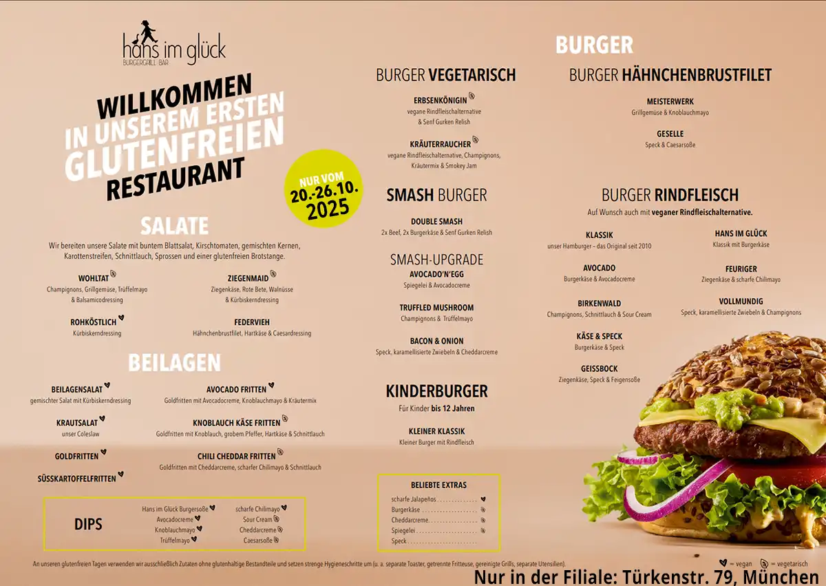 HANS IM GLÜCK – Burgergrill & Bar machts möglich. Sie haben den Wunsch vieler Zölis gehört und machen nun eine glutenfreie Aktionswoche. Es wird in München eine Woche lang eine eigene Speisekarte geben, mit ausschließlich glutenfreien Angeboten und sogar glutenfreies Bier von Bitburger.